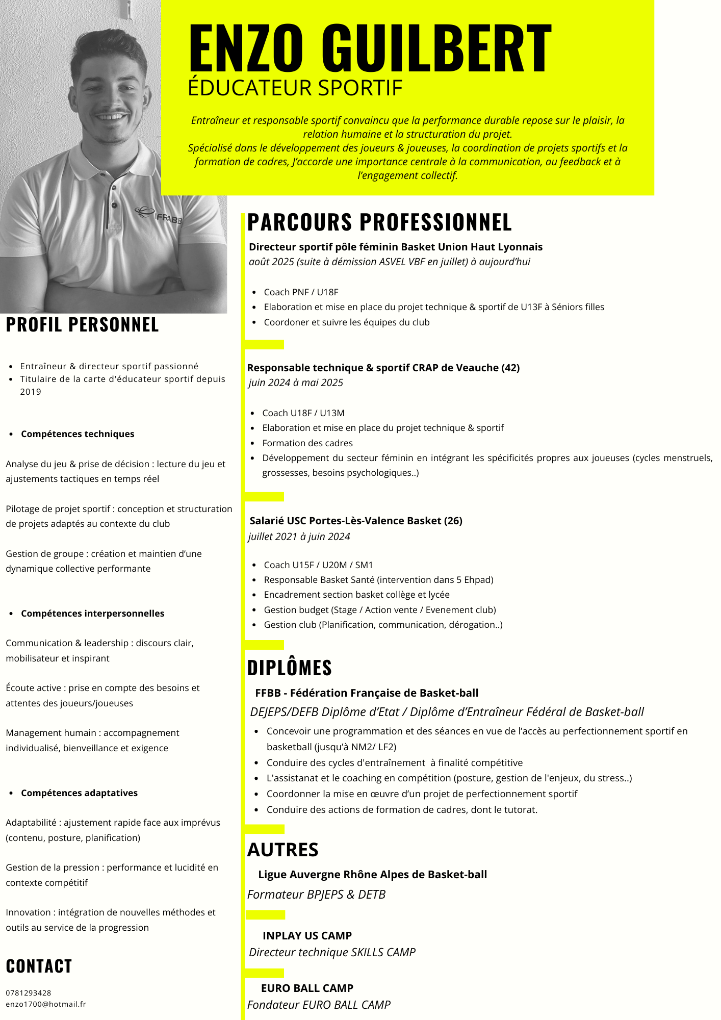 Bonjour, Après plusieurs saisons d’expérience comme entraîneur et responsable sportif, ainsi que la création et la direction de camps de basket, et l’obtention du DEJEPS / DEFB, je souhaite aujourd’hui franchir une nouvelle étape dans mon parcours.Je suis à l’écoute d’un projet club pour la saison 2026-2027, orienté jeunes élite, en lien avec mon appétence […]