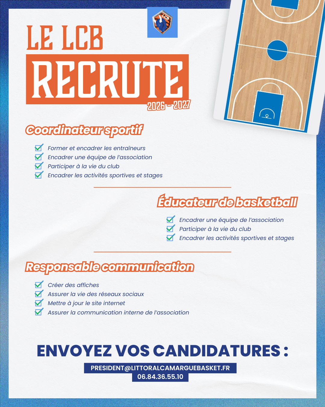 Le Littoral Camargue Basket (Gard, 30) est à la recherche de 3 profils pour la saison 2026-2027 : – Coordinateur sportif – Éducateur de basketball – Responsable communication Le LCB agit sur les communes de St-Laurent-d’Aigouze et Aigues-Mortes dans le Gard. Envoyez votre CV et lettre de motivation dès maintenant. Personne à contacter : FIGUIERE […]